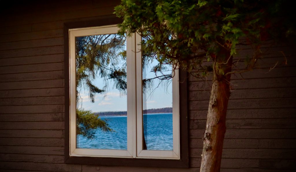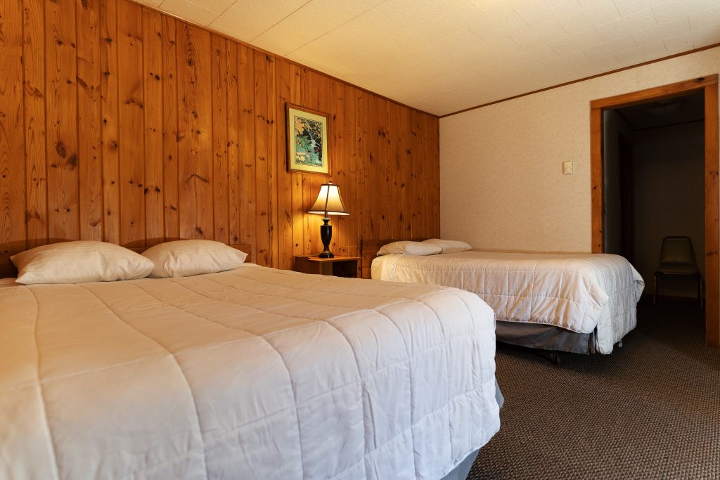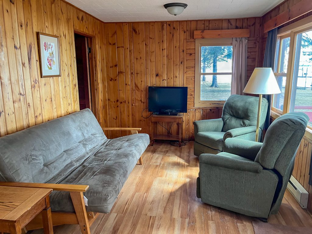 We have two 2 Bedroom Economy Cabins. Each bedroom contains two full beds and an adjacent full bathroom. Both cabins have living areas, as well as a full kitchen, dining area, and a deck with a picturesque view of Lake Bemidji.