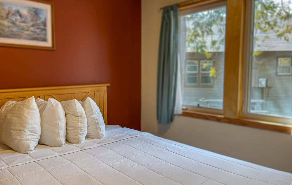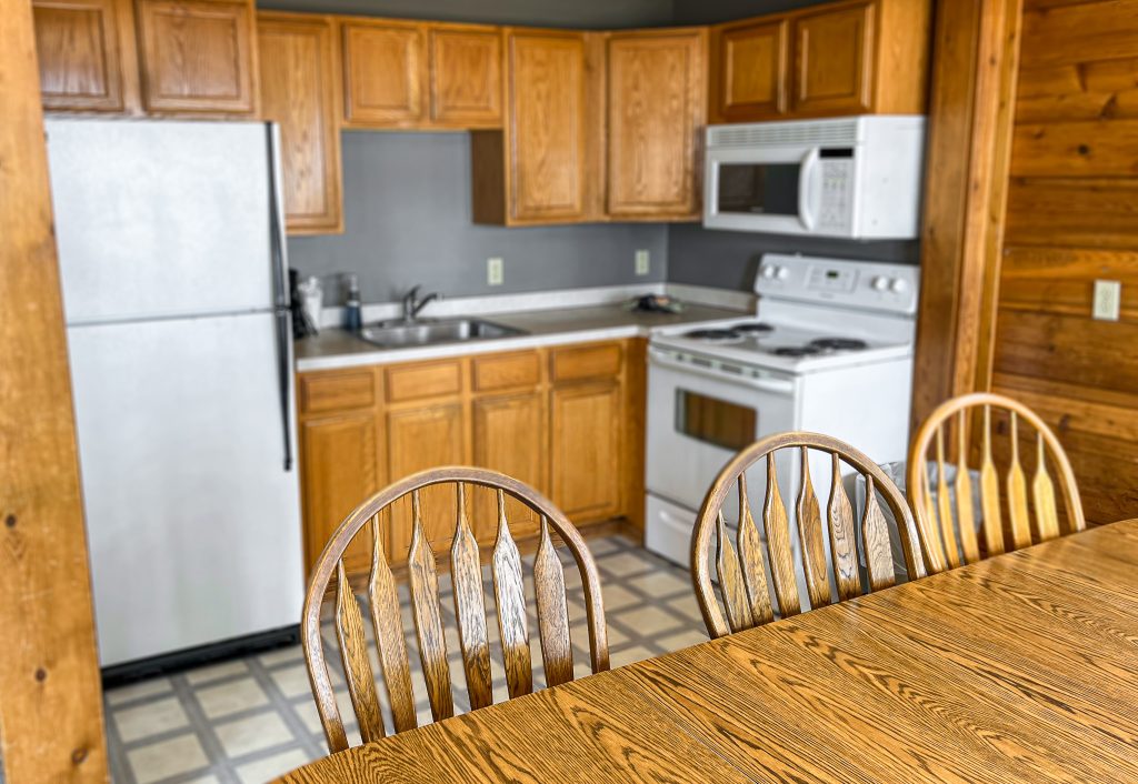 With room for up to eight people, this 4-Bedroom cabin is one of our most popular units. Two rooms contain queen beds; The other two are furnished with 2 twin beds. The living room has a gas fireplace, as well as picturesque windows overlooking the lake and large deck.